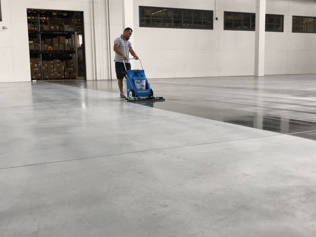 Il trattamento ai silicati di litio è lo step che segue la fase di levigatura del pavimento. Le nanoparticelle di silicati di litio penetrano all’interno delle porosità del calcestruzzo, legandosi ad altri silicati presenti nel composto cementizio, come i metalli alcalini, mutandone la struttura molecolare, che si trasforma in un complesso microcristallino dalle proprietà traspiranti. Il legame che si crea tra le componenti di silicati di litio e la calce rende il calcestruzzo resistente all’umidità e altamente resistente.